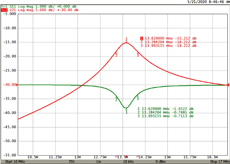 在以這種方式測(cè)量S21 S參數(shù)之后,分析數(shù)據(jù)以提取諧振器的諧振頻率和Q因子。將響應(yīng)的峰值作為共振頻率,然后將兩個(gè)標(biāo)記放置在比峰值低3 dB的位置。峰值頻率除以峰值的3 dB寬度就等于Q因子。