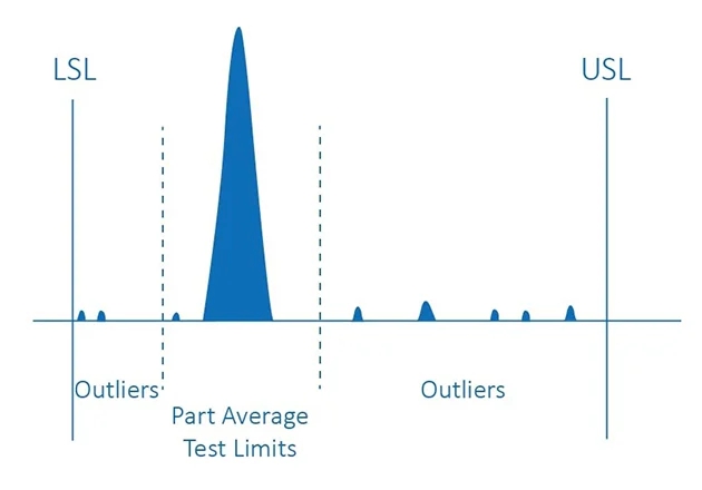 PAT使用統(tǒng)計技術來確定這些測試結果的限制。設置這些測試極限是為了刪除輪廓線(其參數(shù)與典型零件在統(tǒng)計上不同的零件),并且對通過良好控制的過程正確加工的零件的成品率影響應最小。