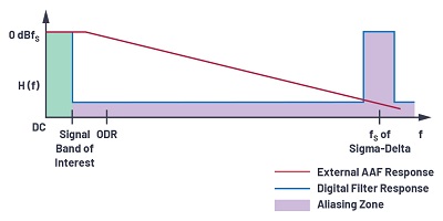 sigma-delta ADC中,輸入以更高的OSR進行過采樣,因此抗混疊濾波器的要求有所放寬,因為采樣頻率遠高于輸入帶寬,如圖8所示。