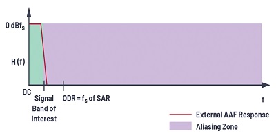 為了在高性能應(yīng)用中消除混疊,使用了更高階的抗混疊濾波器來避免任何數(shù)量的折返??够殳B濾波器是一種低通濾波器,其帶寬限制了輸入信號,并確保信號中沒有超出可以折返的目標帶寬的頻率分量。濾波器的性能將取決于帶外信號與fS / 2的接近程度以及所需的衰減量。