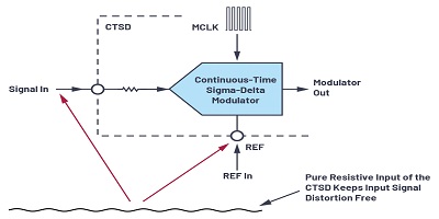 CTSD的兩個主要優(yōu)點是固有的混疊抑制以及信號和參考的電阻輸入。