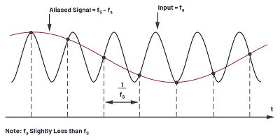 現(xiàn)在考慮信號在圖3中第一個Nyquist區(qū)域之外的情況。信號頻率僅略小于采樣頻率,這與圖2時域表示中所示的條件相對應(yīng)。請注意,即使信號在第一個奈奎斯特區(qū)域之外,其圖像(或別名)fS – fa落在內(nèi)部。返回圖3,很明顯,如果一個不想要的信號出現(xiàn)在fa的任何鏡像頻率上,它也會出現(xiàn)在fa上,從而在第一奈奎斯特區(qū)中產(chǎn)生一個雜散頻率分量。