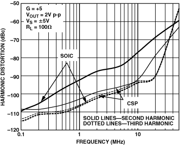 (圖12.AD8099失真比較相同的運(yùn)算放大器在SOICLFCSP封裝.