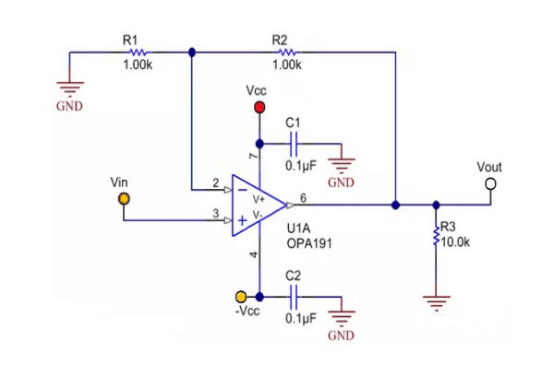 1:具有同相配置的OPA191原理圖OPA191原理圖